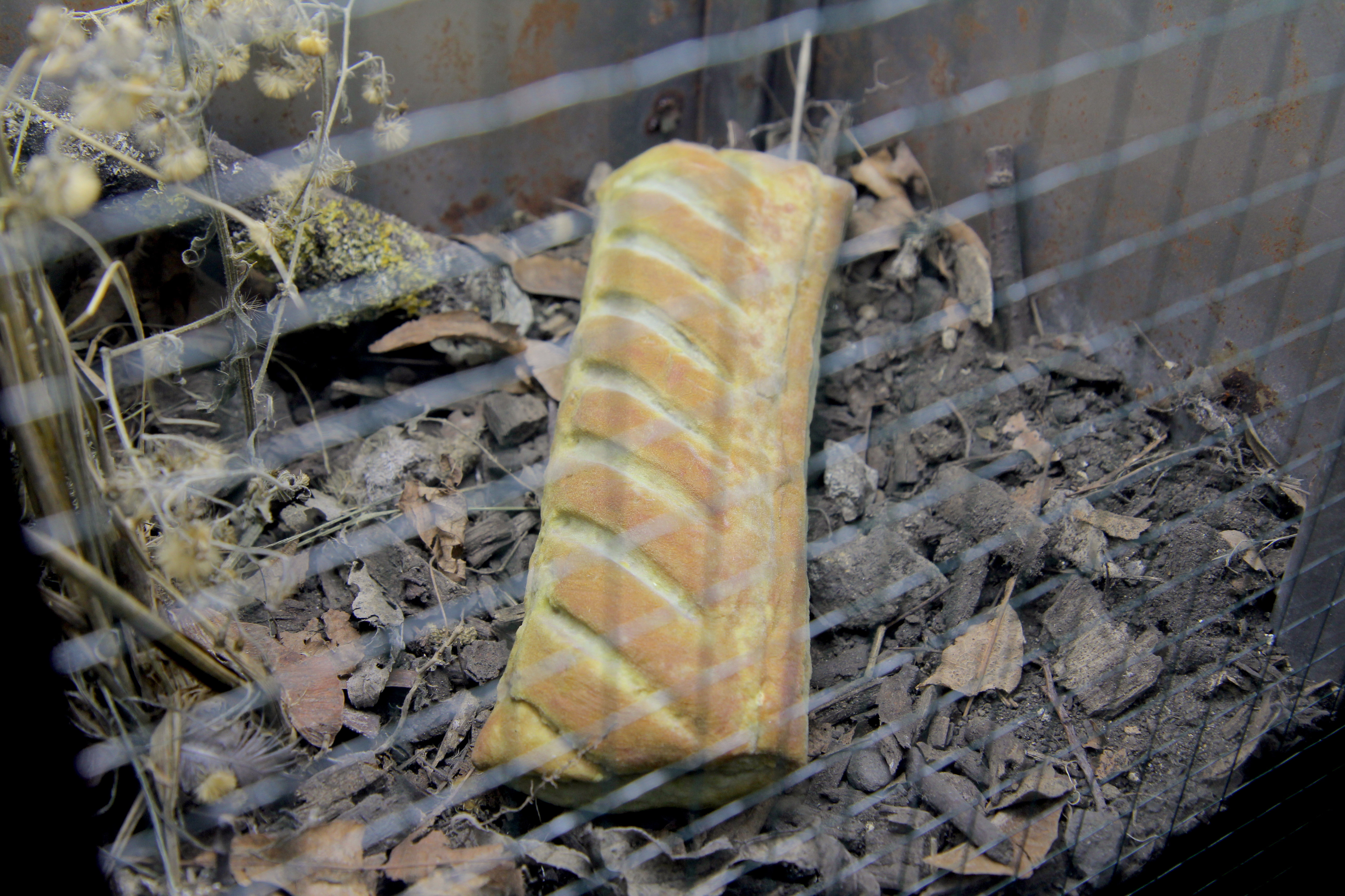 3D printed gypsum, organic detritus, mild steel, wired safety glass, LED lighting